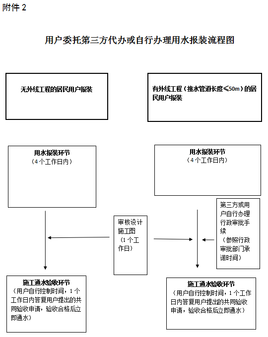 ②用戶委托第三方或自行辦理的,時(shí)限由用戶控制,綠城水務(wù)在1個(gè)工作日內(nèi)完成設(shè)計(jì)施工圖審核,1個(gè)工作日內(nèi)答復(fù)用戶提出的共同驗(yàn)收申請(qǐng),驗(yàn)收合格后立即通水。