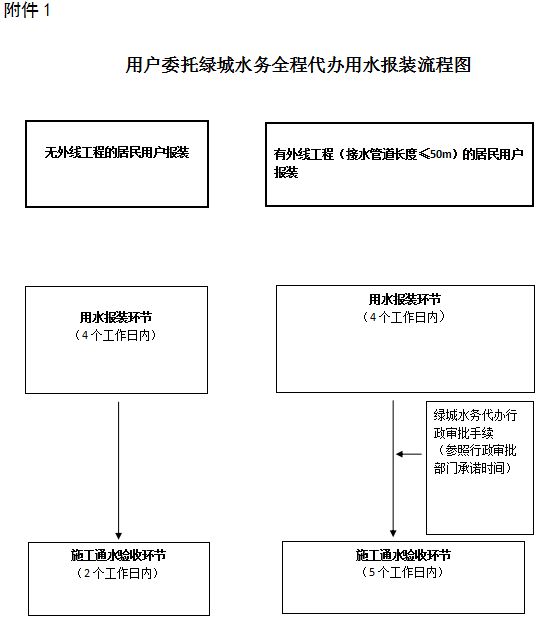 ①委托綠城水務(wù)全程代辦的,無外線工程施工通水驗(yàn)收時(shí)間不超過2個(gè)工作日,有外線工程(外線工程長(zhǎng)度≤50m)施工通水驗(yàn)收時(shí)間不超過5個(gè)工作日,不包含辦理行政審批手續(xù)時(shí)間。