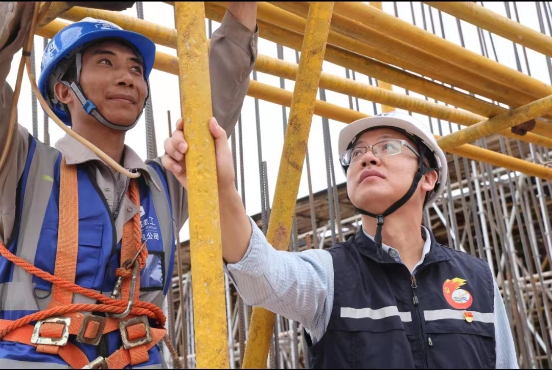 (“水工兵”建設(shè)先鋒隊(duì)隊(duì)員覃長瑜(右)正一絲不茍地和施工方查看鋼筋綁扎情況)