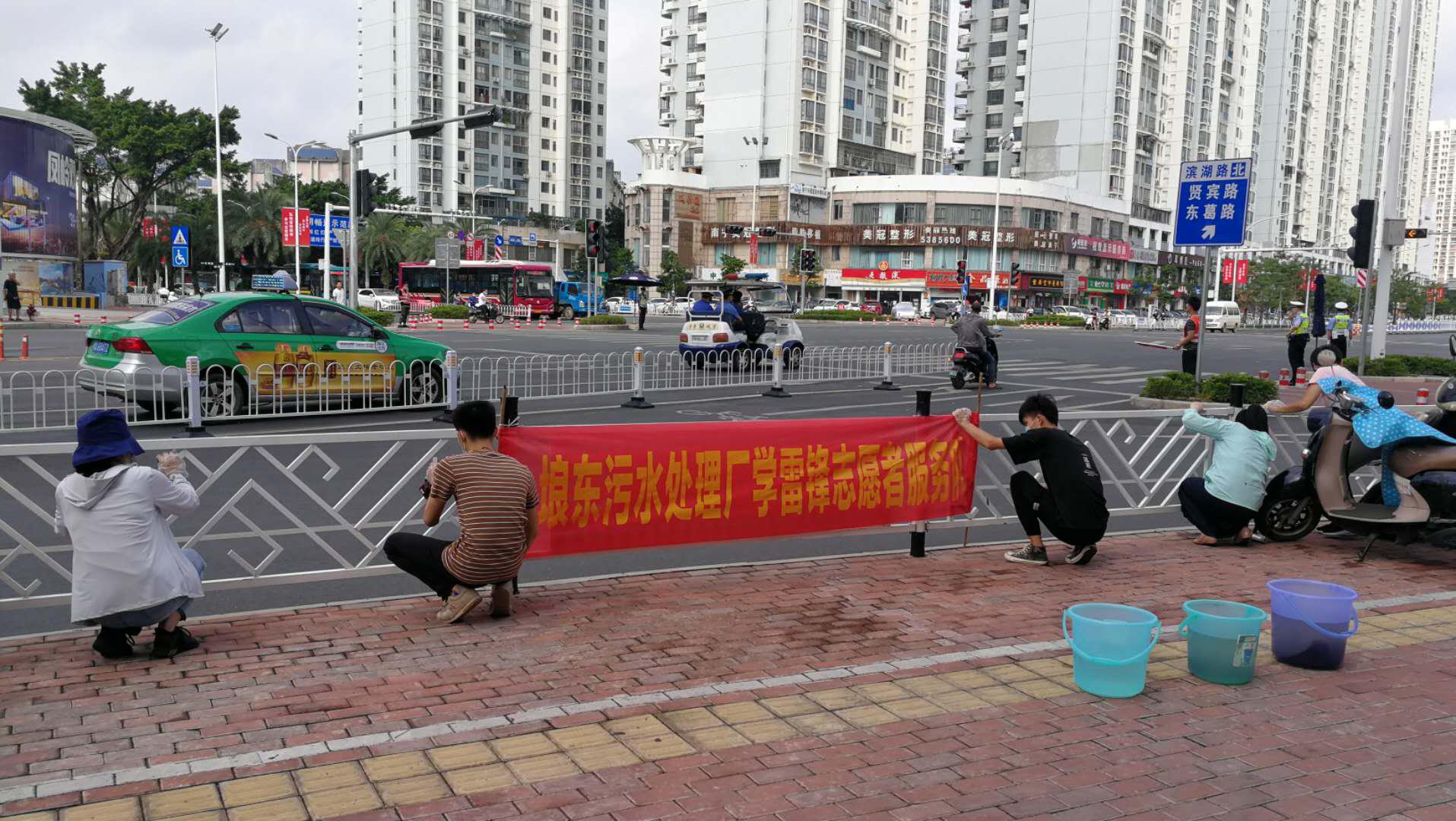 埌東污水處理廠的志愿者們拿起抹布、提著水桶等清潔工具,來到青秀區清洗道路圍欄。他們兵分兩路,一組負責維護交通秩序,保障志愿者安全,另外一組負責擦拭,大家干得熱火朝天,在他們的努力下,整條街道的圍欄煥然一新。